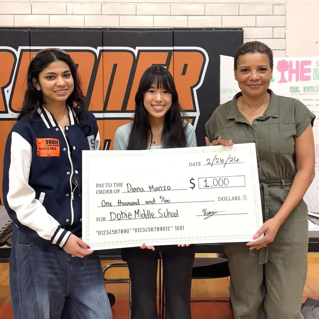 On February 26, 2026, All the Same Organization sent Dobie Middle School a $1,000 check. The funds, raised entirely through ATS’s efforts, will provide essential resources for students at Dobie, where over 95% of the student population lives below the poverty line.
